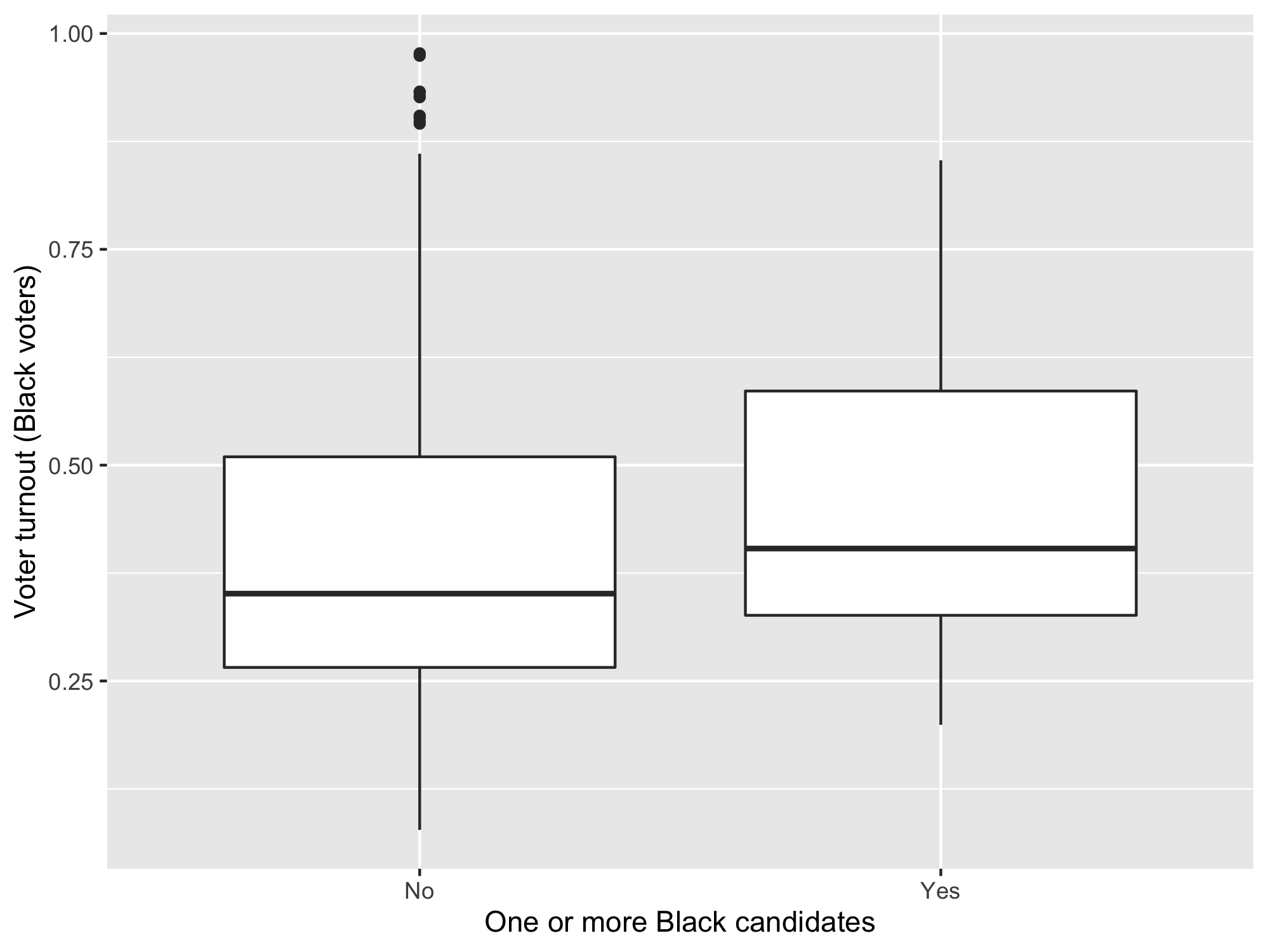 Create a boxplot that compares Black turnout in elections with and without a co-ethnic candidate and save the plot as turnout_box. Your plot should look like this: