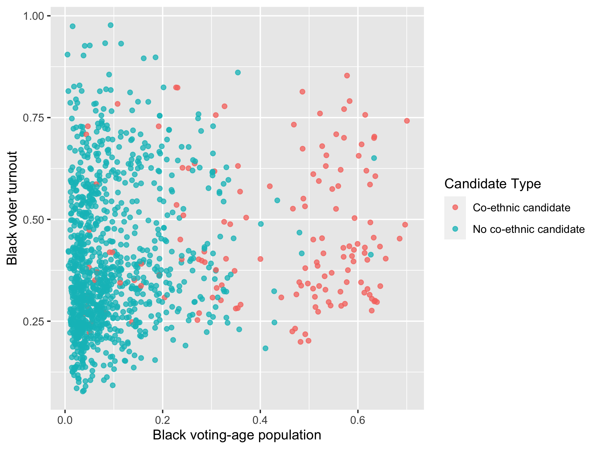 Answer these questions in the write-up: What does this graph seem to imply about the relationship between Black voting-age population and Black turnout? What does it tell us about the relationship between Black voting-age population and the presence of a Black candidate?